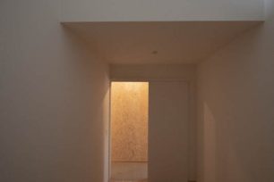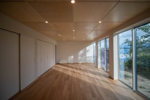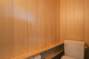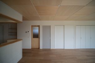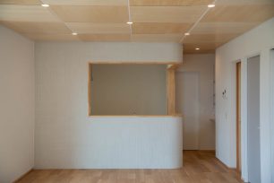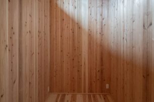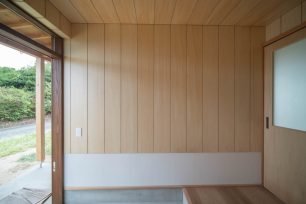 住宅部分は、シナベニヤ仕上に目地の幅や色の調整で表情をつけています。
