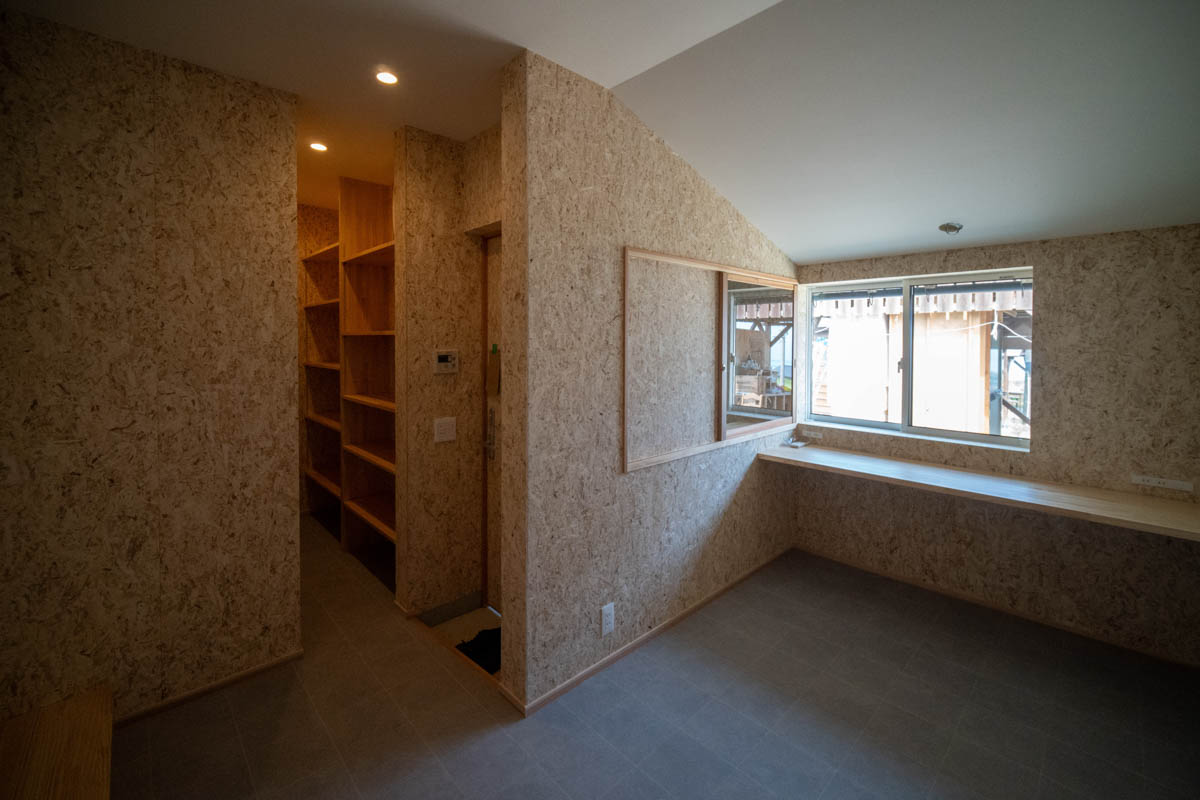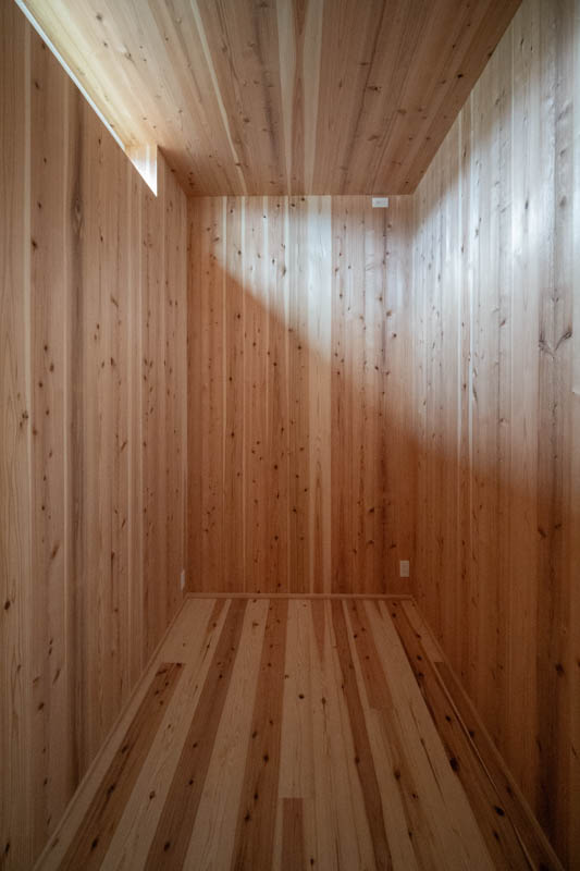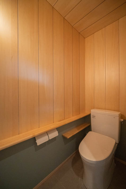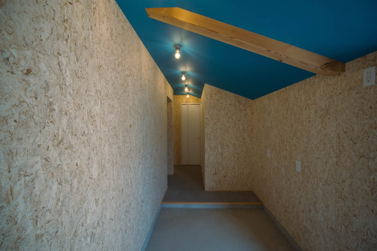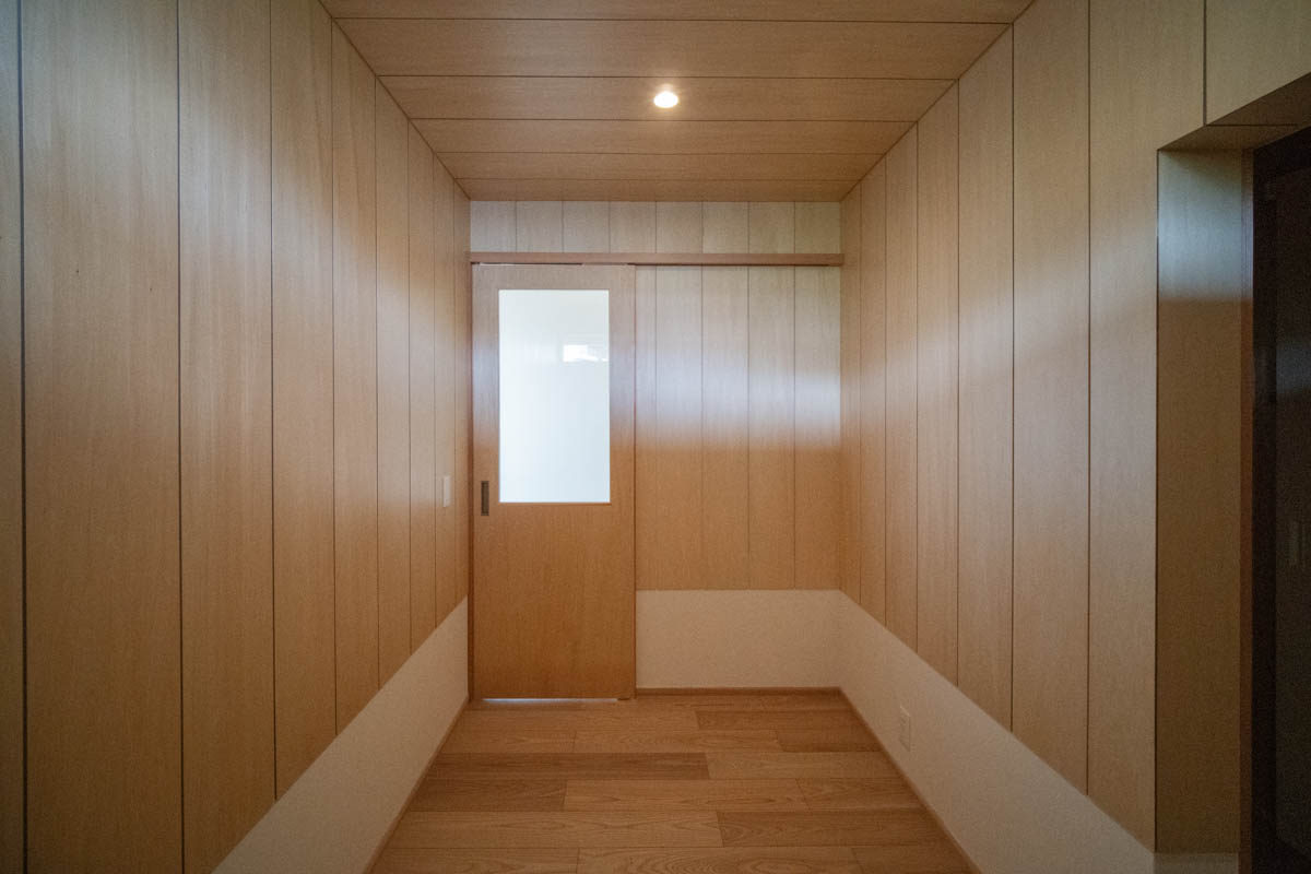 住宅部分は、シナベニヤ仕上に目地の幅や色の調整で表情をつけています。