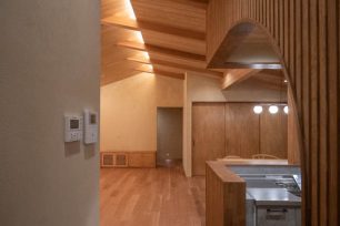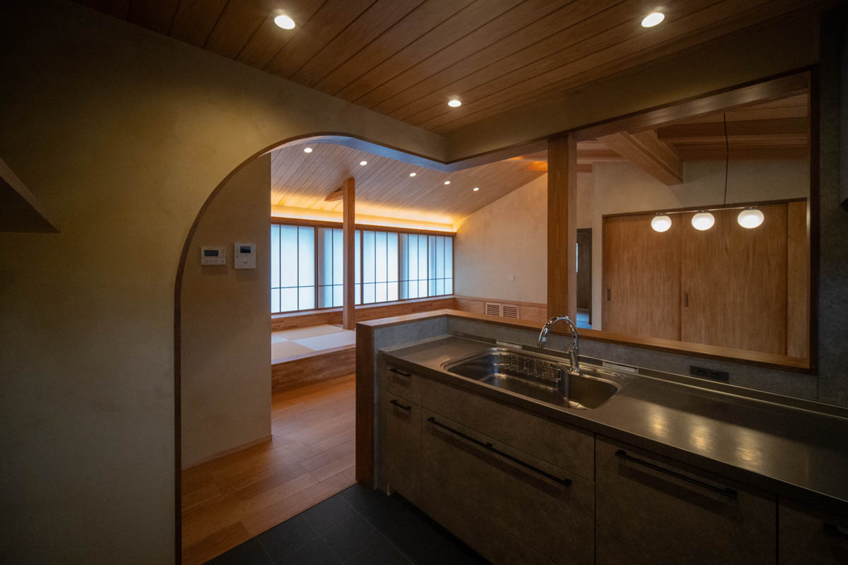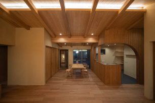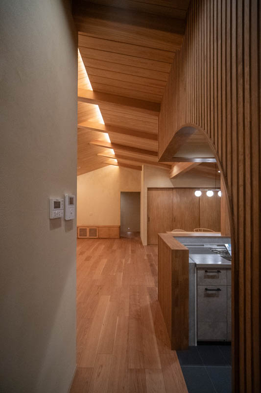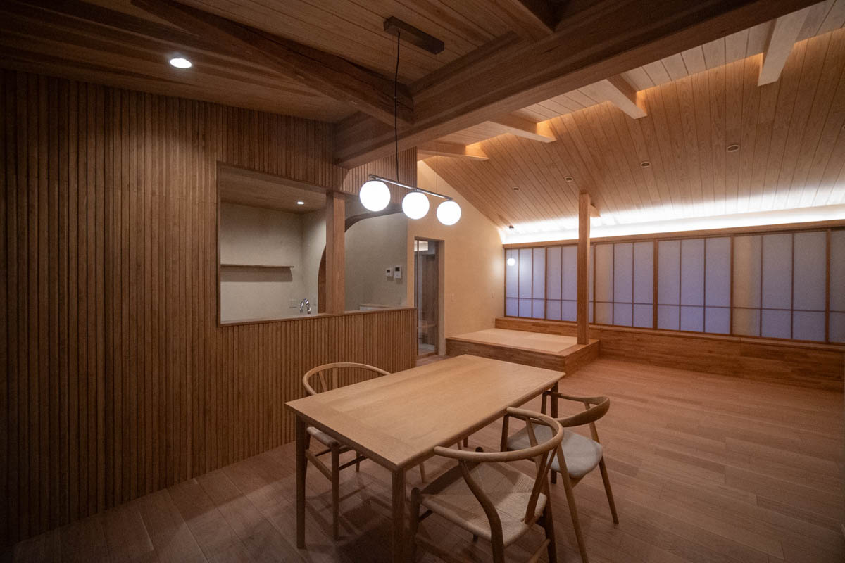 二重屋根の構造を活かした勾配天井とし、光と高さのあるLDKを設けています。